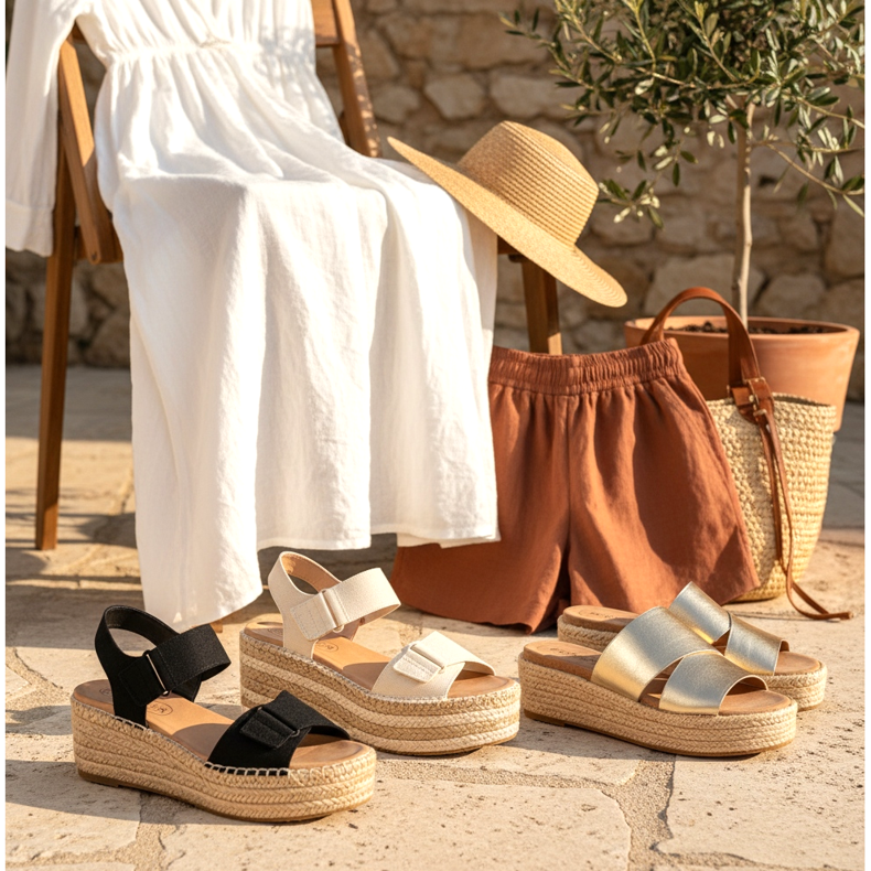 Na ciepłe, wiosenne i letnie dni idealnym wyborem są sandały oraz klapki na platformie. W tym sezonie szczególnie popularne są modele inspirowane espadrylami — platforma wykonana z jutowego splotu nadaje butom naturalnego, letniego charakteru, a jednocześnie jest lżejsza niż tradycyjna gumowa podeszwa.