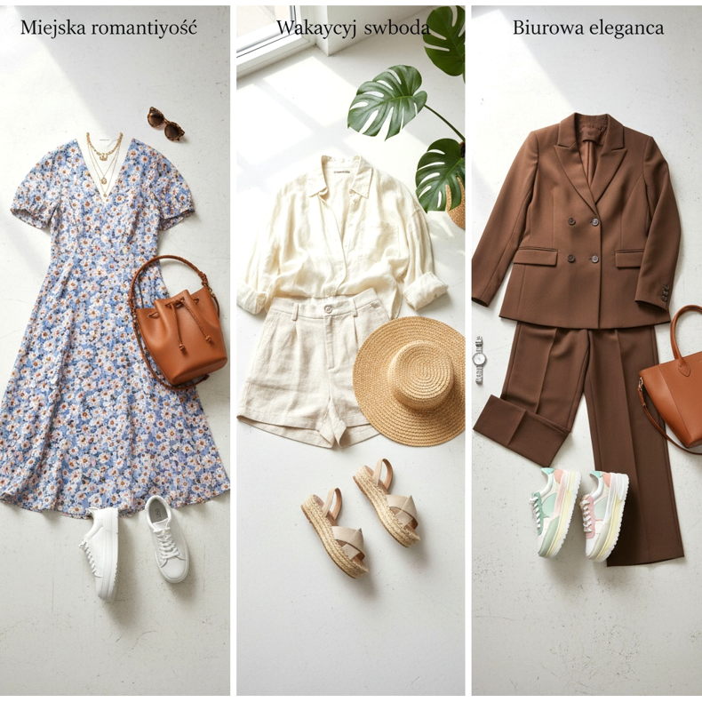 Look 1: Miejska romantyc zność — kwiecista sukienka midi + białe sneakersy na platformie + skorzana torebka bucket w naturalnym brązie. Dodać delikatną biuterię i okulary przeciwsłoneczne.