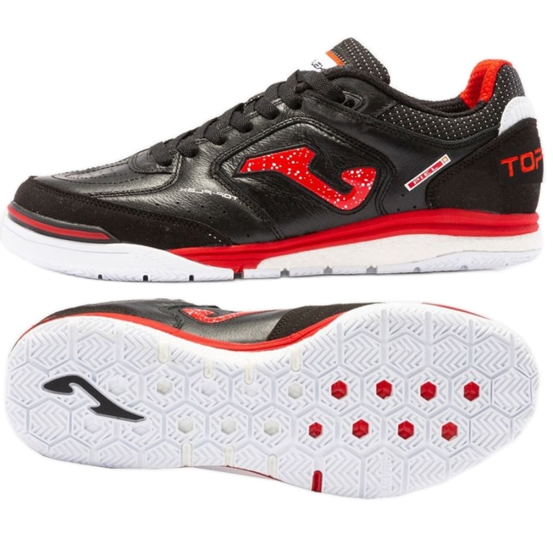 Buty piłkarskie Joma Top Flex Rebound 2301 IN — halówki dla mężczyzn, ściśle dopasowane, w kolorze czarnym z czerwonymi akcentami. Niski, sznurowany fason zapewnia pewne trzymanie stopy i pełną swobodę ruchu podczas gry w hali.