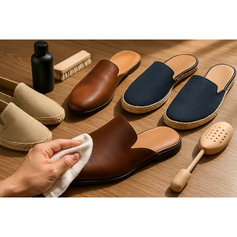 Skórzane mule należy regularnie czyścić wilgotną ściereczką i impregnować preparatami do skóry, aby nie niszczyły się od wilgoci i słońca. Espadryle i materiałowe babusze można czyścić szczoteczką i mydłem, unikając namaczania juty lub plecionej podeszwy. Ważne jest przewietrzanie obuwia po każdym użyciu, zwłaszcza przy noszeniu na boso. Używanie wkładek zapachowych i antybakteryjnych pomaga utrzymać świeżość. Przechowuj je w chłodnym, przewiewnym miejscu, unikając bezpośredniego słońca.