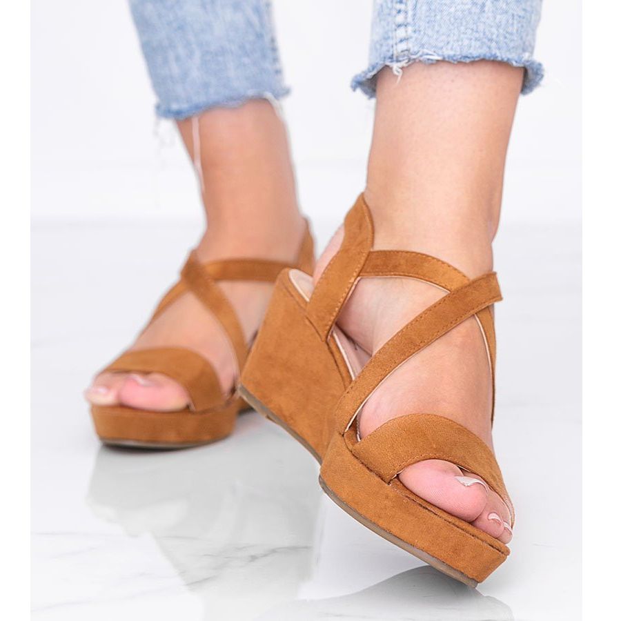 Szczegóły: Camelowe sandały na koturnie Bianco brązowe