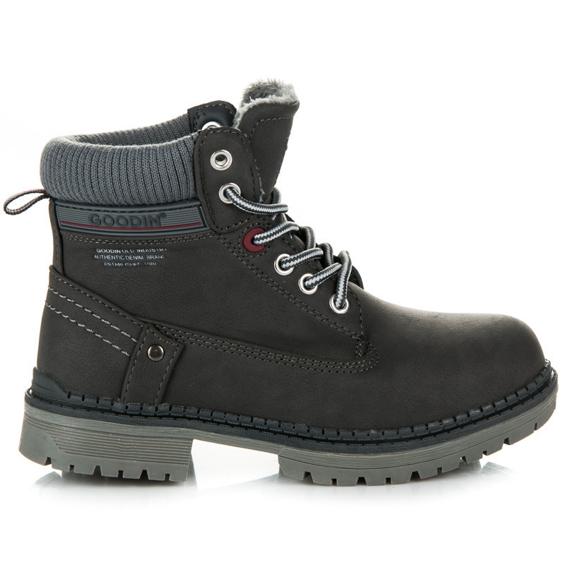 Solidne i stylowe traperki dla chłopca marki Goodin. Wykonane ze skóry ekologicznej w uniwersalnym szarym kolorze, na wygodne sznurowanie — idealne na co dzień i na aktywne zabawy na świeżym powietrzu.