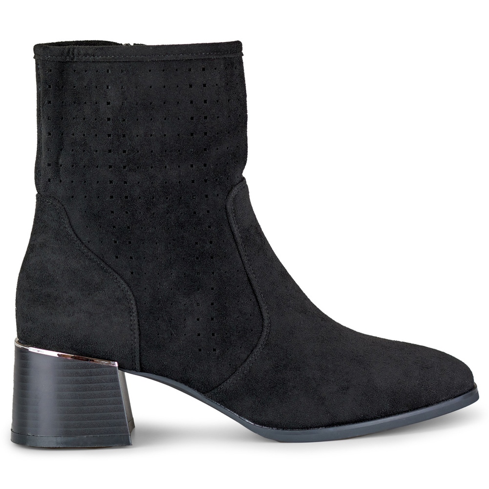 Botki łączą klasyczną formę z modnymi, ażurowymi detalami, które podkreślają kobiecą stylistykę bez rezygnacji z wygody. Niski słupek o wysokości 5 cm stabilnie podtrzymuje stopę i optycznie wysmukla sylwetkę, a suwak ułatwia zakładanie i ściąganie. Ekologiczny zamsz wygląda elegancko i jest przyjemny w dotyku, natomiast skórzana wkładka zwiększa komfort chodzenia przez cały dzień.