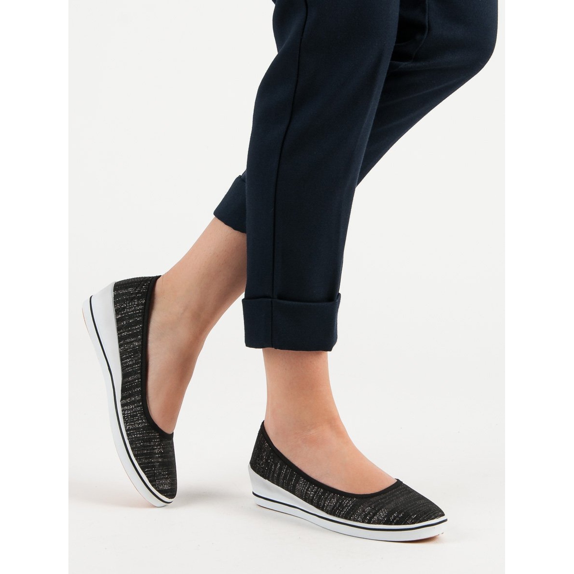 Czarne Baleriny na Koturnie od marki Comer to doskonały wybór dla kobiet ceniących wygodę i elegancję w codziennym życiu. Te klasyczne buty wsuwane wyróżniają się okrągłym noskiem i miękkim, usztywnionym zapiątkiem, które zapewnia komfort nawet podczas długiego noszenia. Wykonane z przyjemnej w dotyku plecionej tkaniny, balerinki delikatnie mieni się szarością, dodając im subtelnego uroku.