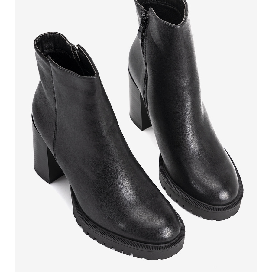 Wysoki gruby słupek o wysokości 10,5 cm optycznie wydłuża nogi, a komfort noszenia sprawia, że botki są idealne zarówno na codzienne wyjścia, jak i na bardziej formalne okazje. Klasyczny okrągły nosek dodaje im stylowego charakteru, a czarny kolor sprawia, że będą pasować do wielu stylizacji.