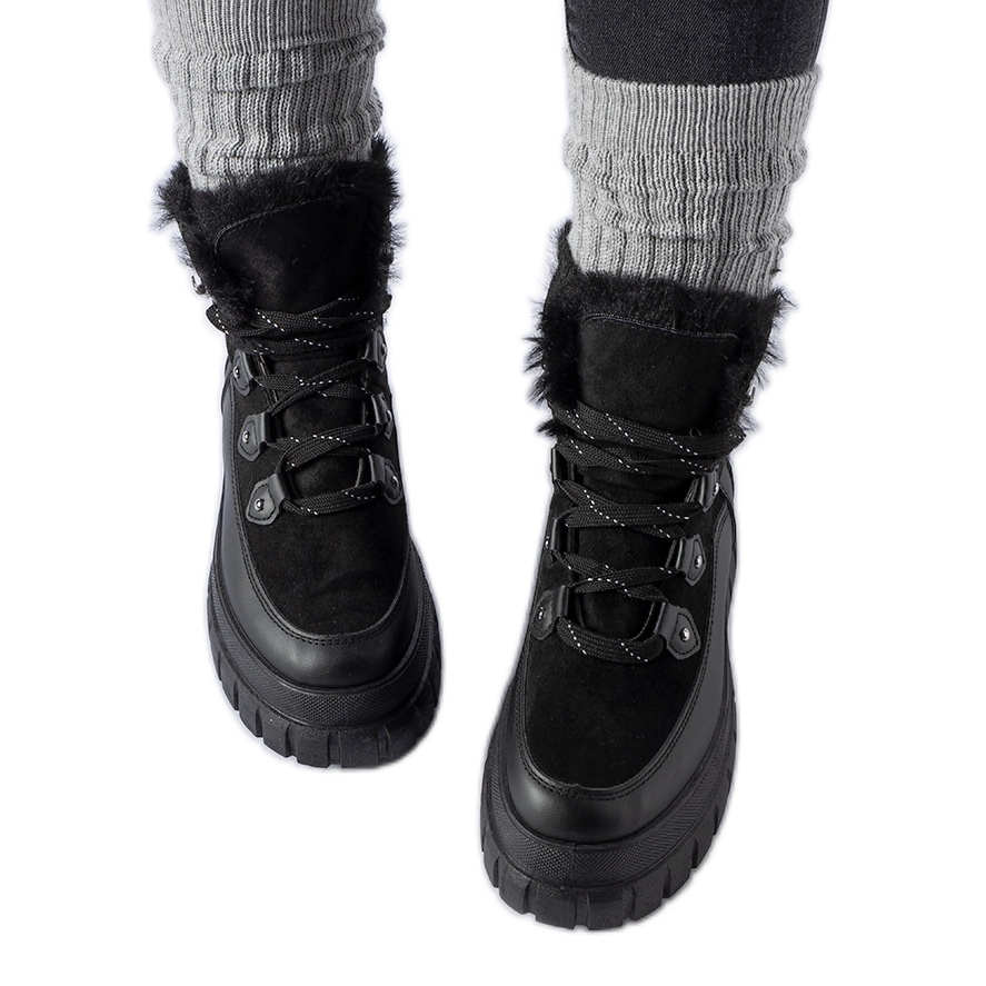 Czarne botki na masywnej podeszwie Cervantes — styl, komfort i ciepło na chłodniejsze dni. Klasyczny fason za kostkę w nowoczesnym wydaniu: cholewka ze skóry ekologicznej o efektownej fakturze nadaje butom charakteru, a okrągły nosek podkreśla uniwersalny, elegancki wygląd. Sznurowanie z gumowym elementem na cholewce umożliwia łatwą regulację szerokości, dzięki czemu buty idealnie dopasowują się do stopy. Ocieplone wnętrze z futerkiem zapewnia przyjemne ciepło nawet w niskich temperaturach, a masywna podeszwa z gumy i platforma (6 cm) gwarantują stabilność oraz amortyzację przy każdym kroku. Dzięki średniej wysokości cholewki (ok. 19 cm) botki sprawdzą się zarówno do codziennych, jak i bardziej eleganckich stylizacji.
