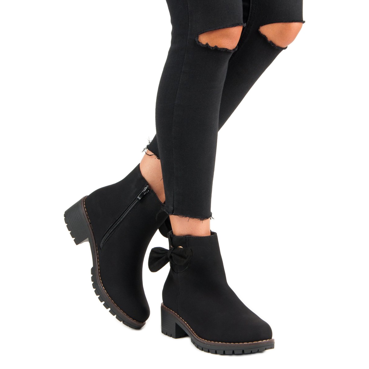 Botki charakteryzują się płaskim obcasem w formie słupka o wysokości 4,5 cm, co zapewnia wygodę przez cały dzień użytkowania. Ich matowa cholewka została subtelnie ozdobiona materiałowymi kokardkami, co dodaje im fasonu i lekko rockowego charakteru. Ocieplenie z koca obuwniczego wewnątrz buta gwarantuje komfort termiczny nawet w chłodniejsze dni, a praktyczne zapięcie na suwak sprawia, że zakładanie i ściąganie butów jest szybkie i łatwe.