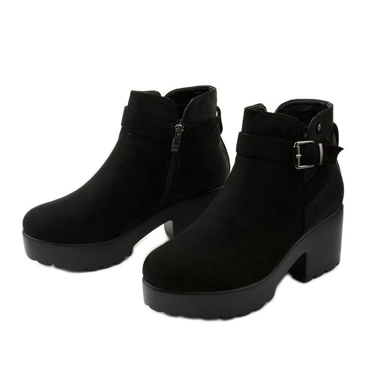 Wysokość obcasa wynosząca 7,5 cm oraz solidna platforma gwarantują stabilność oraz wygodę noszenia przez cały dzień. Czarny kolor sprawia, że botki łatwo skomponujesz z różnorodnymi stylizacjami – od casualowych po eleganckie. Okrągły nosek i wysoka cholewka, sięgająca za kostkę, dopełniają ich nowoczesny look.