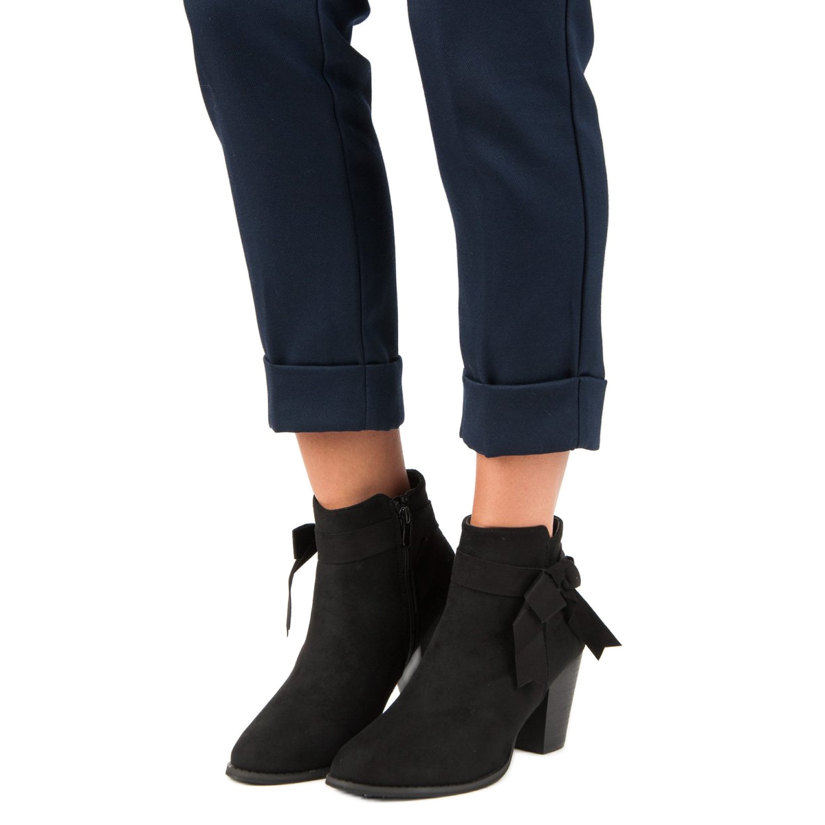 Botki są wykonane z wysokiej jakości ekologicznego zamszu, co zapewnia im wyjątkową trwałość oraz estetyczny wygląd. Urocza kokardka umieszczona z boku cholewki nadaje im niepowtarzalnego charakteru, sprawiając, że są idealnym dopełnieniem każdej stylizacji. Ich elegancki czarny kolor sprawia, że pasują niemal do wszystkiego – od casualowych zestawów po wieczorowe kreacje.