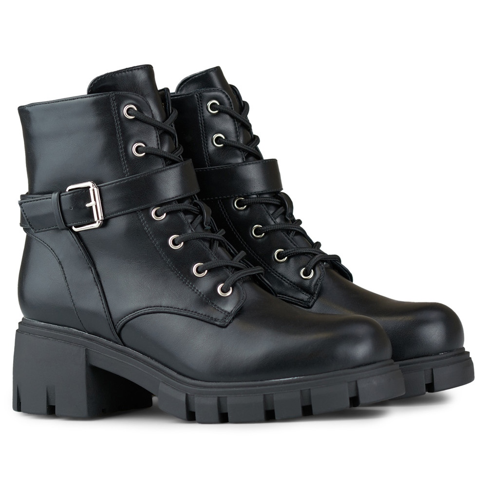 Szczegóły: Czarne botki sznurowane z ekoskóry na niskim obcasie