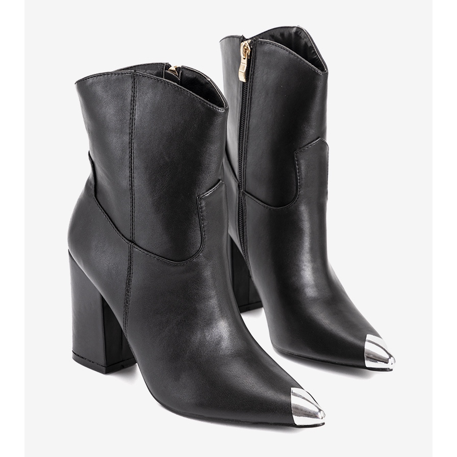 Odkryj nowy wymiar stylu z czarnymi botkami typu kowbojki Breton! To modny wybór dla kobiet ceniących sobie elegancję oraz komfort. Te wyjątkowe buciki wyróżniają się metalicznym zakończeniem noska, co nadaje im niepowtarzalnego charakteru i stylowego wyglądu.