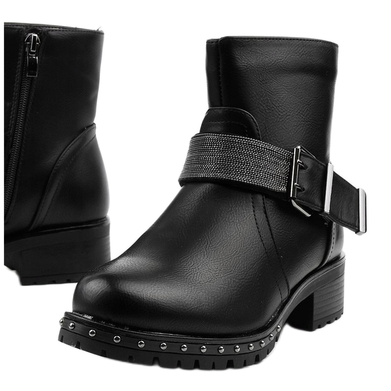 Ich oryginalna klamra ozdobiona cekinami oraz podeszwa z metalowymi nitami nadają im niepowtarzalnego charakteru i sprawiają, że te botki przyciągają wzrok. Z boku cholewki znajduje się praktyczny suwak, który ułatwia zakładanie i zdejmowanie obuwia.
