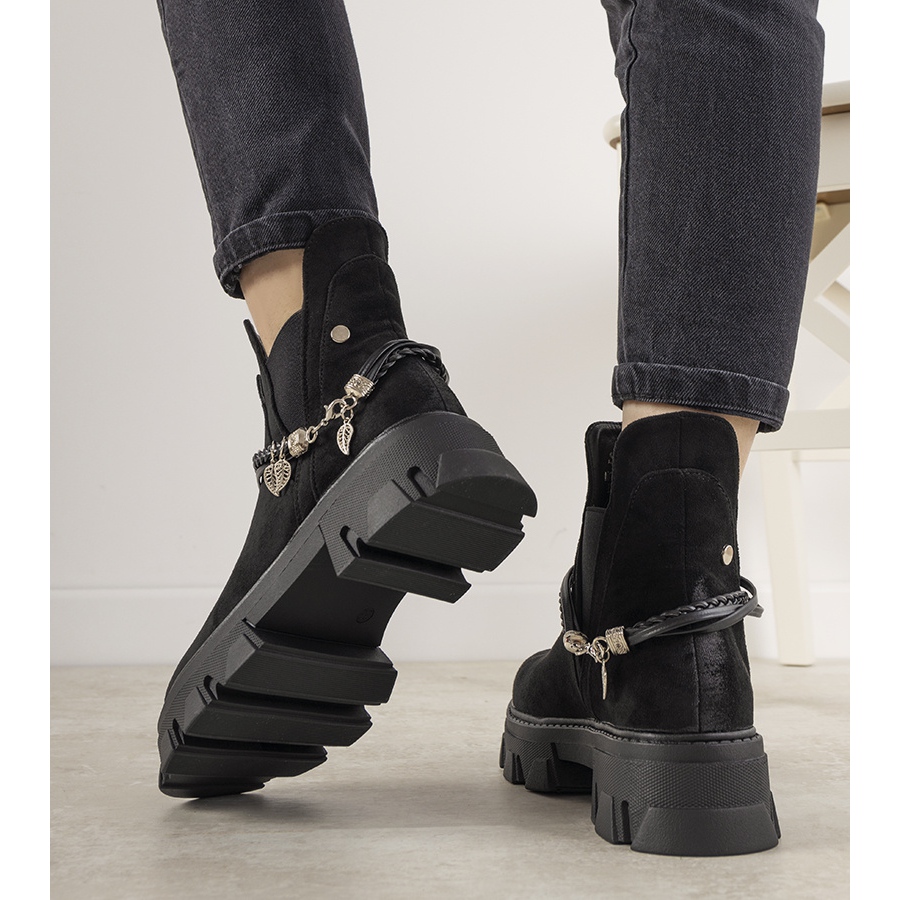 Czarne botki z bransoletką Fearless to doskonały wybór na nadchodzący sezon jesień-zima. Te stylowe buty, wykonane z wysokiej jakości ekologicznej skóry zamszowej, łączą w sobie elegancję i wyjątkowy charakter. Ich efekt wytarcia na nosku dodaje im oryginalności, a wysoka, wzorzysta podeszwa sprawia, że przyciągają spojrzenia.