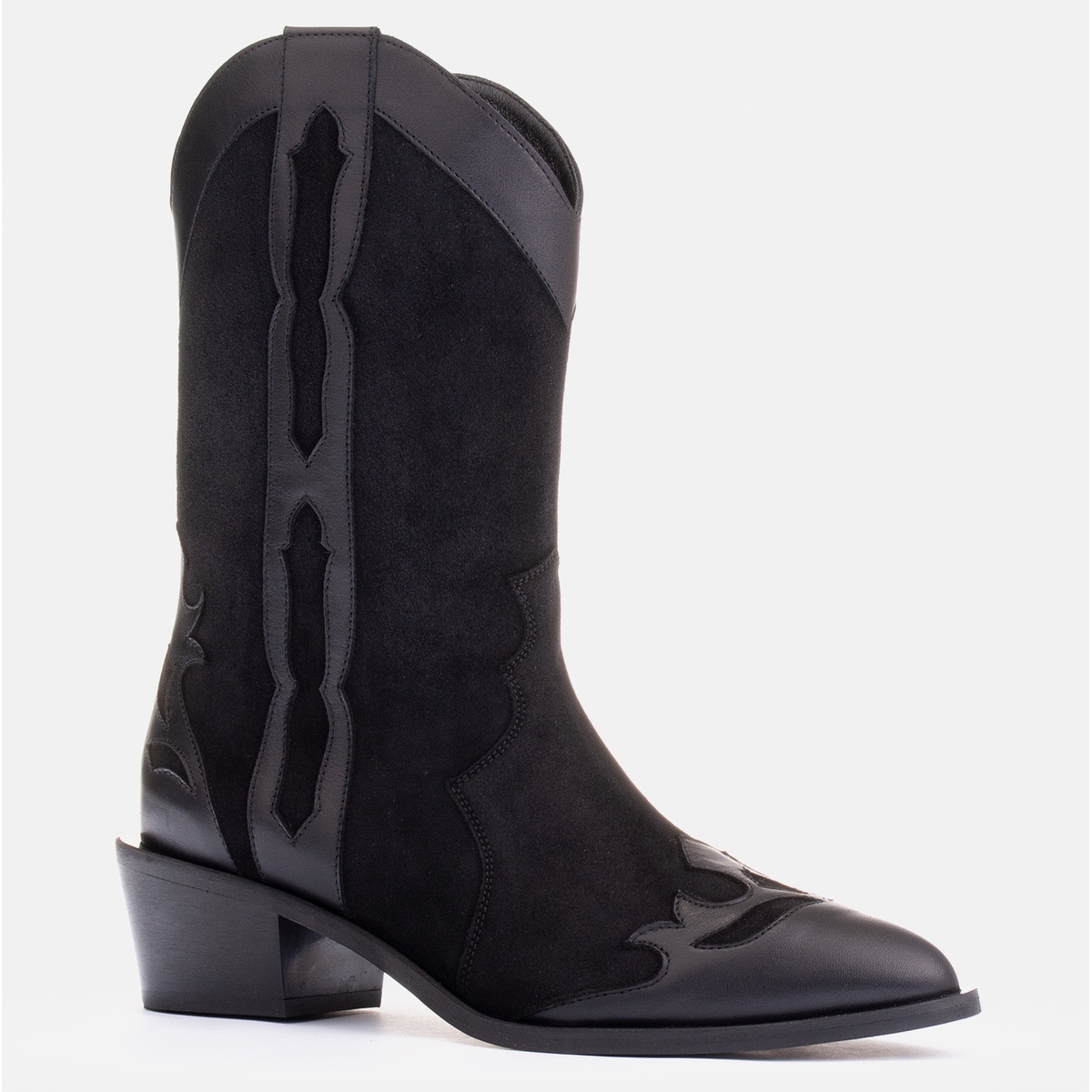 Odkryj elegancję i styl kowbojski z naszymi czarnymi botkami od Marco Shoes! Te wyjątkowe kowbojki, sięgające połowy łydki, wykonane są z wysokiej jakości weluru bydlęcego, co zapewnia im nie tylko trwałość, ale i unikalny wygląd.