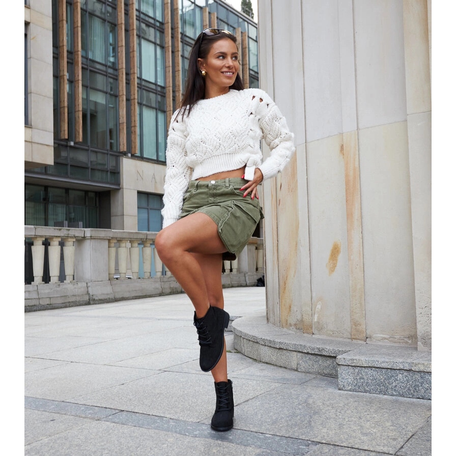 Eleganckie i wygodne botki, które dodadzą blasku każdej zimowej stylizacji. Okrągły nosek nadaje im subtelności, a wysoka cholewka sięgająca za kostkę (15 cm) zapewnia ochronę i komfort podczas chłodniejszych dni. Dekoracyjne cyrkonie przyciągają uwagę, podkreślając wyjątkowy charakter obuwia — idealne zarówno do casualowych zestawów, jak i na wieczorne wyjścia.