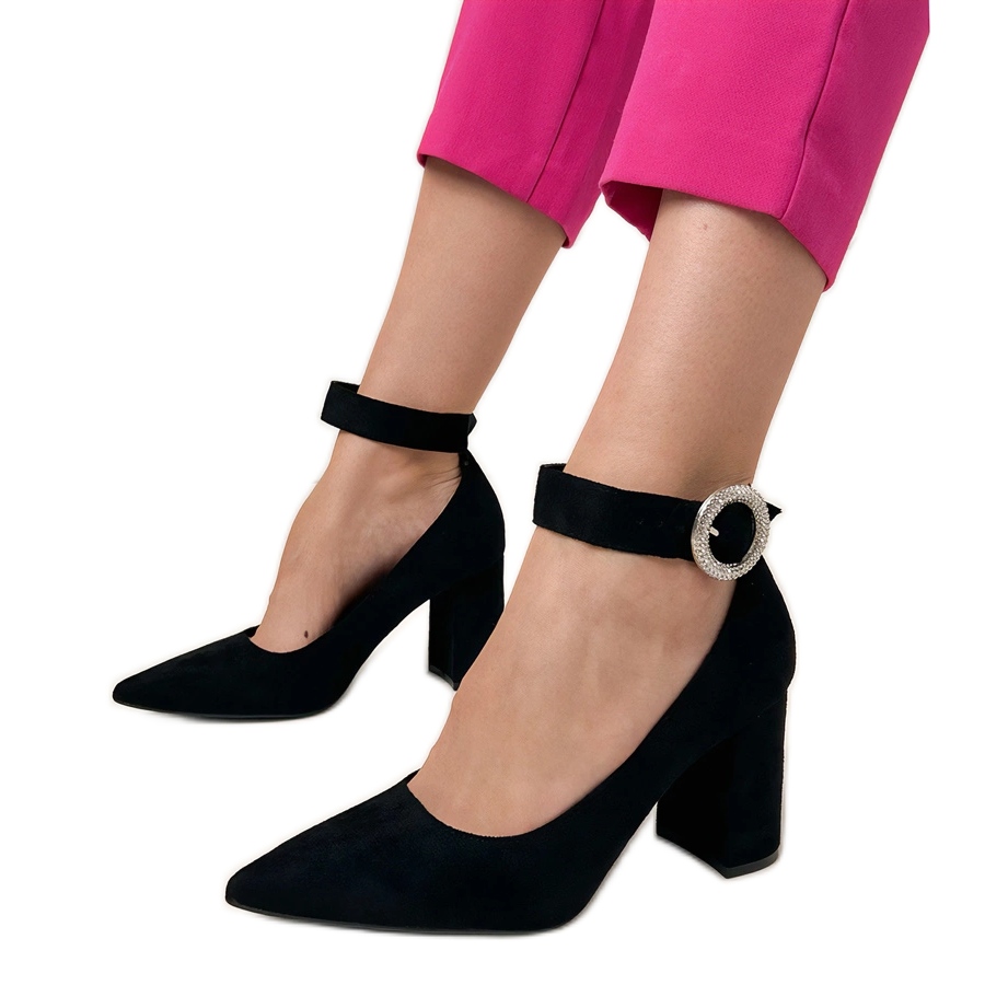 Szczegóły: Czarne czółenka na słupku ze sprzączką i cyrkoniami
