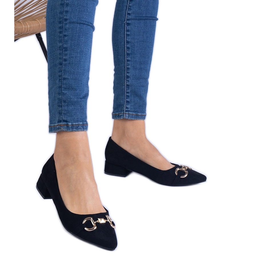 Inna marka Czarne czółenka z ekozamszu ze złotą ozdobą
