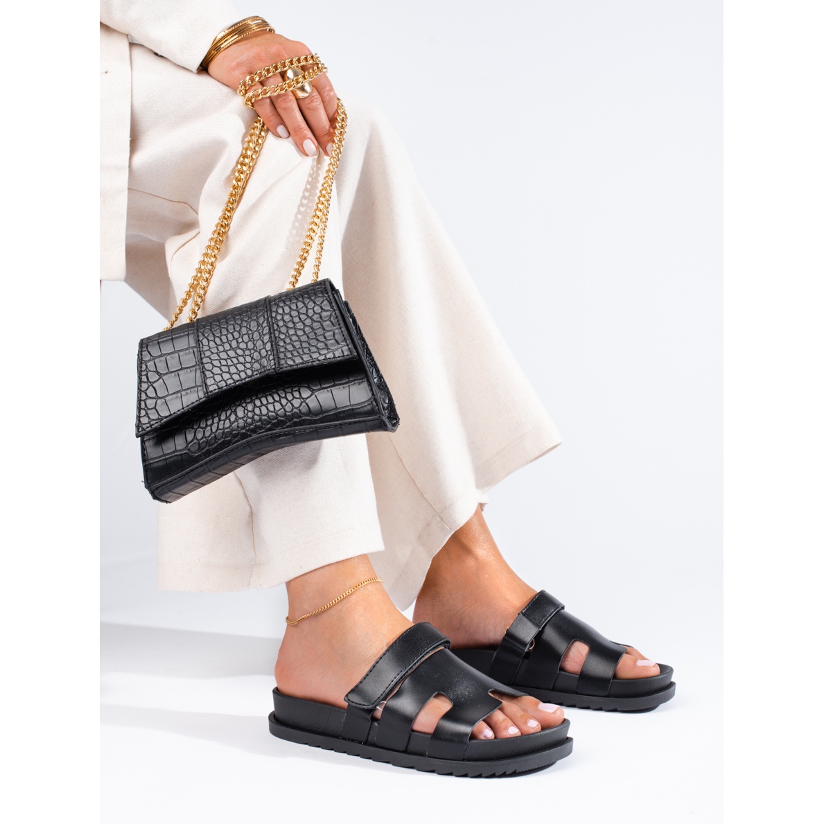 Wielką zaletą tego modelu klapków jest ich uniwersalna kolorystyka – klasyczna czerń sprawdzi się w zestawieniu z niemal każdą kolorystyką ubrań i dodatków. Gruba platforma o wysokości 2 cm dodaje modowego charakteru, jednocześnie nie wymuszając na użytkowniczce nienaturalnej pozycji stopy.
