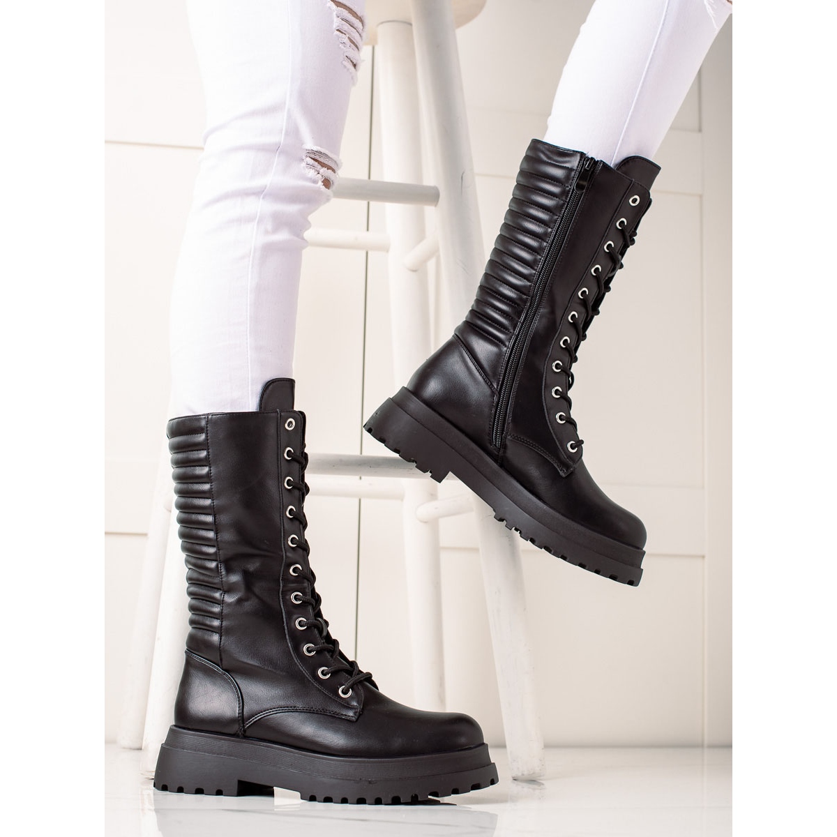 Wykonane z wysokiej jakości materiałów, glany mają miękki, zabudowany zapiętek oraz ocieplenie, które zapewnia ciepło nawet w chłodniejsze dni. Ich cholewka sięgająca do połowy łydki oraz okrągły nosek dodają charakteru, a platforma o wysokości 3,5 cm i płaski obcas 5 cm gwarantują wygodę użytkowania przez wiele godzin.