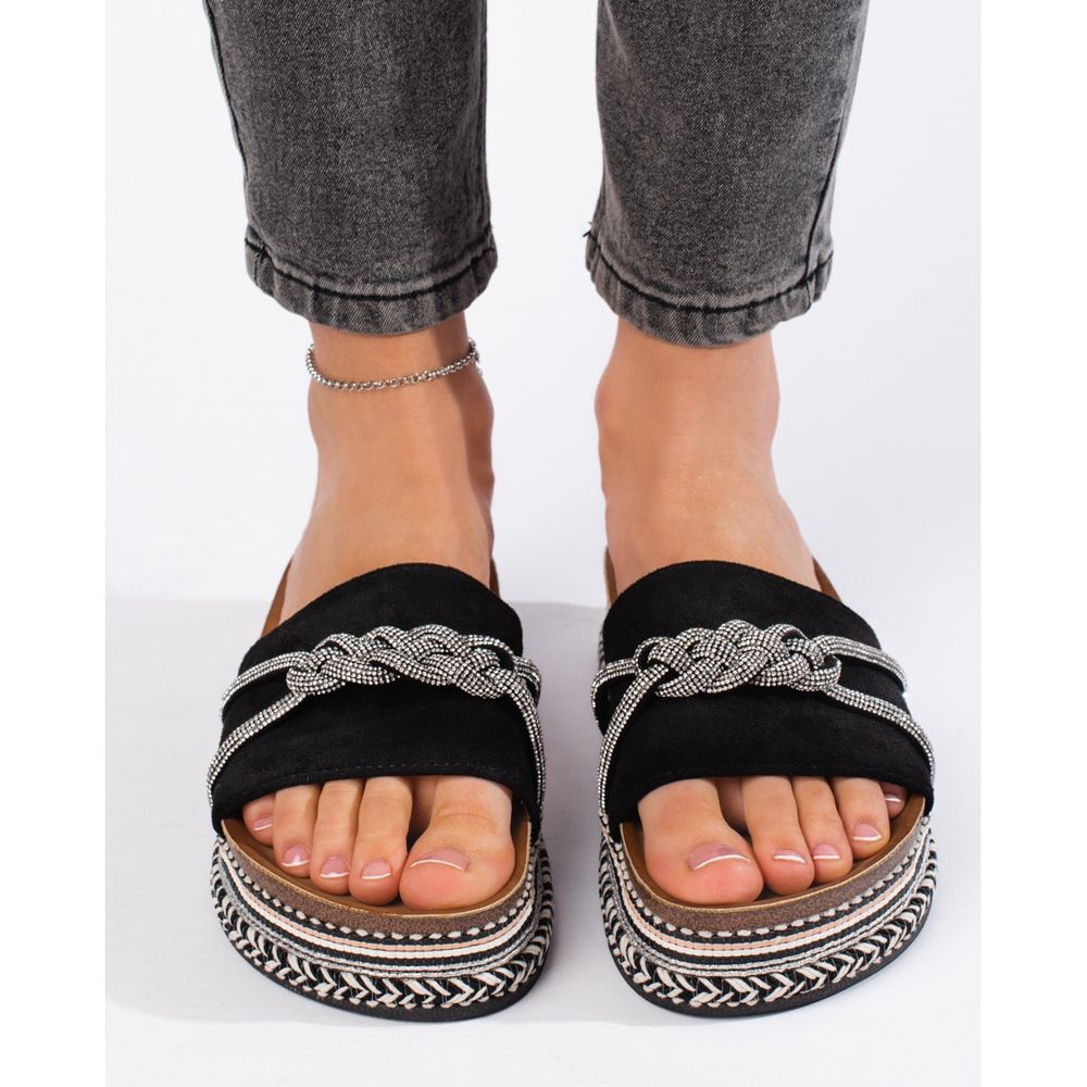Czarny kolor z dodatkiem cyrkonii nadaje klapkom eleganckiego wykończenia, sprawiając, że będą doskonałym uzupełnieniem zarówno codziennych, jak i bardziej eleganckich stylizacji. Wnętrze klapków wykończone jest tekstylną wkładką, co podnosi komfort noszenia przez dłuższy czas.