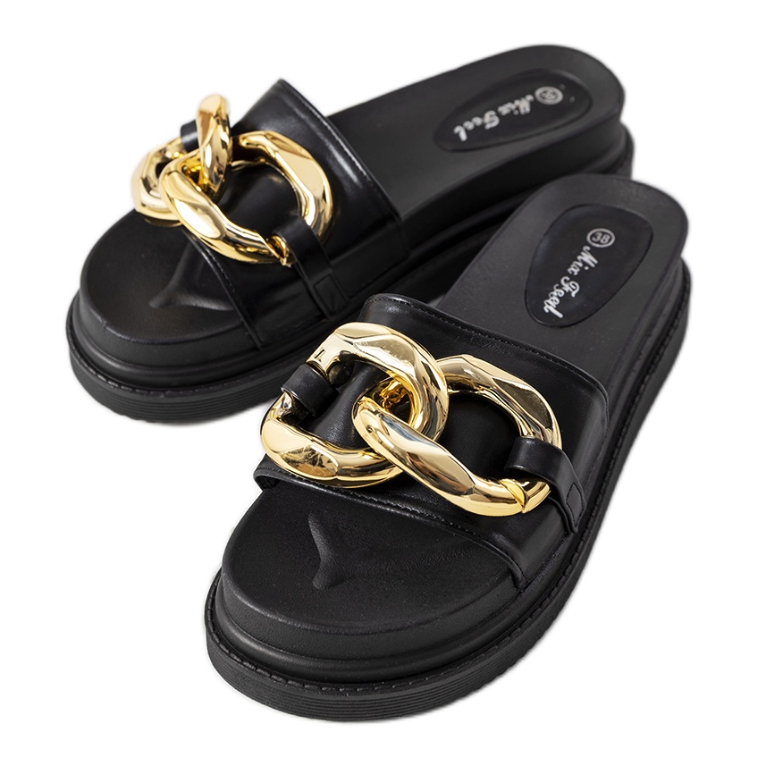 Wykonane z wysokiej jakości skóry ekologicznej, klapki Berloz łączą w sobie nowoczesny design z funkcjonalnością. Okrągły nosek oraz platforma o wysokości 5 cm zapewniają wygodę noszenia, a ich klasyczny czarny kolor sprawia, że pasują do każdej stylizacji. Dodatkowym atutem jest subtelny łańcuch, który nadaje im oryginalnego charakteru.