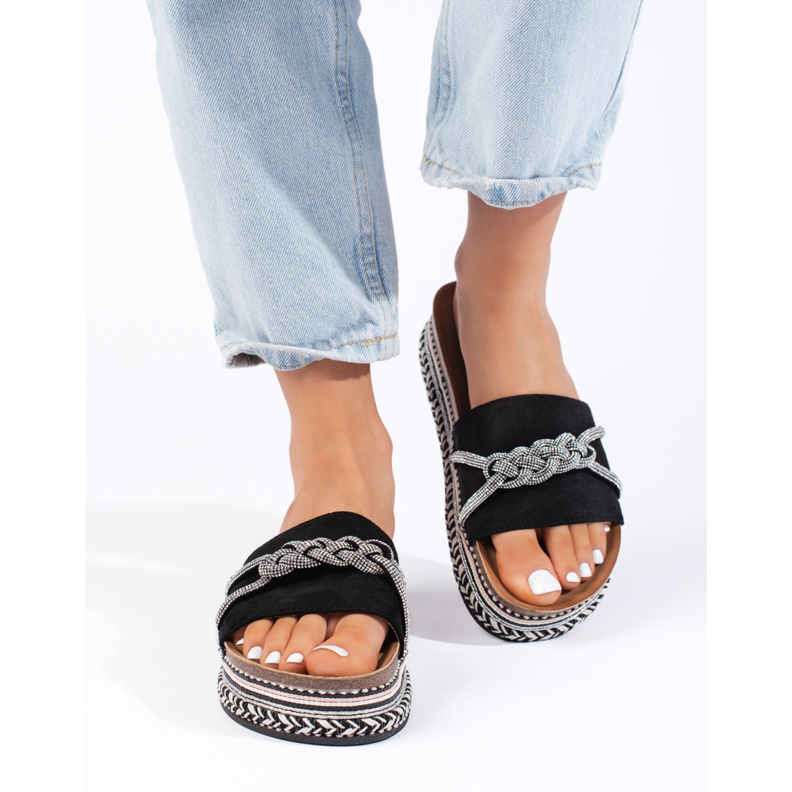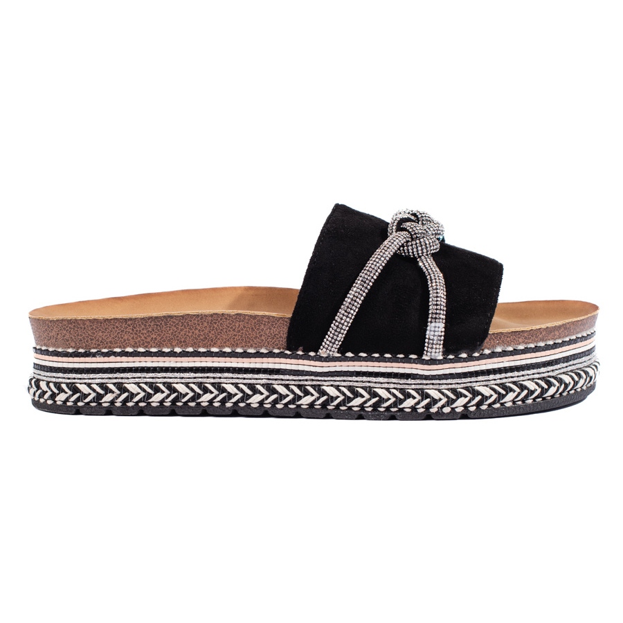 Dodatkowo, wewnętrzna wkładka z imitacji zamszu sprawia, że stopy czują się komfortowo, a cyrkonie dodają klapkom niepowtarzalnego blasku. Klasyczny czarny kolor sprawia, że będą pasować do wielu stylizacji – od codziennych, po te bardziej eleganckie.