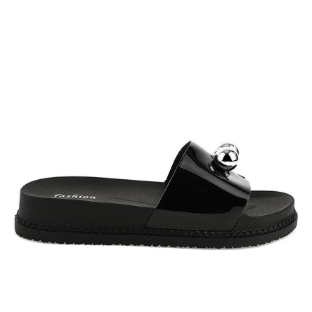 Podeszwa jest wykończona czarnym sznureczkiem, co nadaje butom kobiecego charakteru, czyniąc je idealnym wyborem na letnie dni. Model dostępny jest w klasycznym czarnym kolorze, co sprawia, że łatwo go dopasować do różnych outfitów. Klapki mają wsuwany fason, co gwarantuje szybkie i łatwe zakładanie.