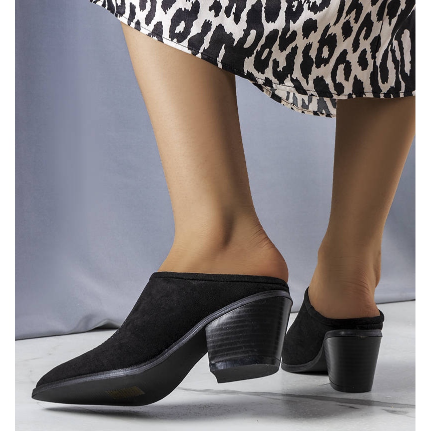 Czarne klapki z zabudowanym przodem Linda to must-have w każdej letniej garderobie. Te eleganckie i jednocześnie komfortowe klapki damskie przyciągają uwagę swoim wyjątkowym stylem, który nawiązuje do kowbojskiego obuwia. Szeroki, lekko skośny obcas o wysokości 6 cm oraz szpiczasty nosek nadają im elegancji, a zabudowana cholewka doskonale eksponuje atuty stopy.
