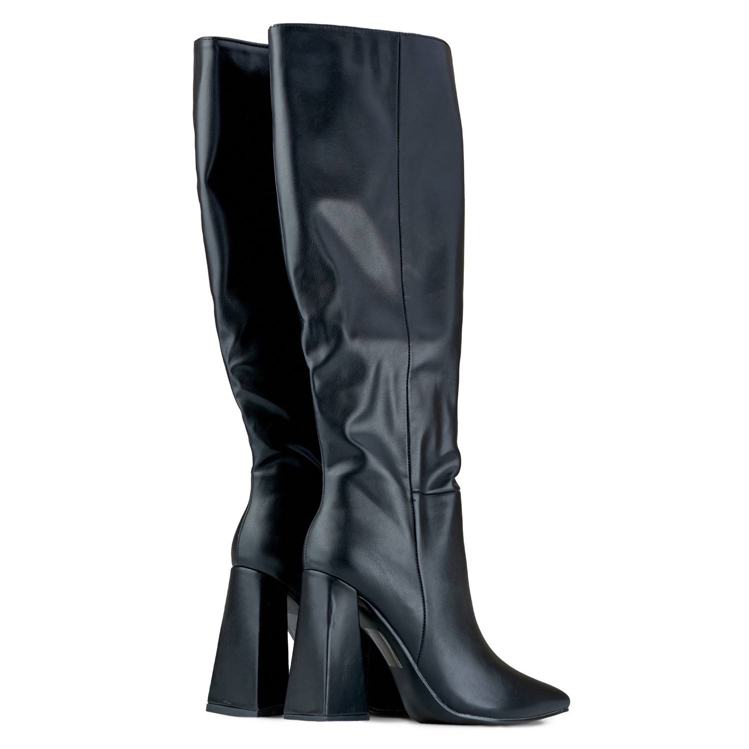 Czarne kozaki na wysokim słupku z ekoskóry — klasyka w nowoczesnym wydaniu