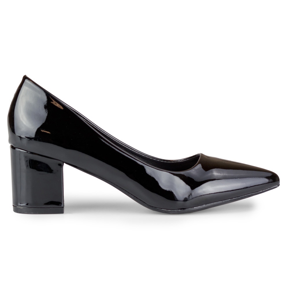 Czarne lakierowane czółenka na niskim słupku — elegancja i wygoda na co dzień i na specjalne okazje. Wykonane z wysokiej jakości skóry ekologicznej o lakierowanym wykończeniu, prezentują się bardzo szykownie i łatwo dopasowują do wielu stylizacji — od biurowych po wieczorowe.