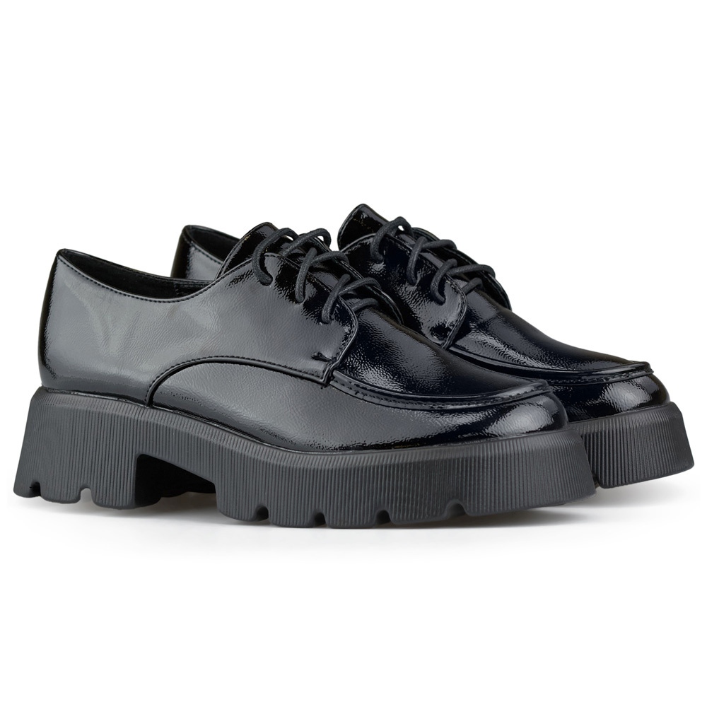 Szczegóły: Czarne lakierowane wiązane półbuty damskie półbuty na grubej podeszwie
