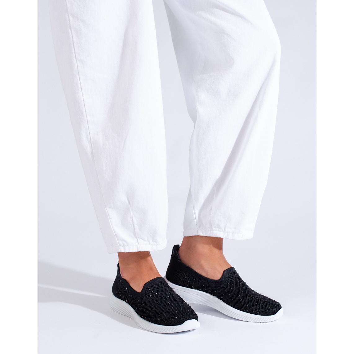 Oto czarne materiałowe buty wsuwane slip on z ćwiekami od znanej marki Shelovet, które doskonale wpisują się w sportowy i casualowy styl. Idealne na co dzień, te modne buty zapewnią komfort i swobodę ruchów dzięki zabudowanemu, miękkiemu zapiętku oraz elastycznemu materiałowi wierzchniemu, który wykonany jest w 100% z trwałego tekstylnego materiału.