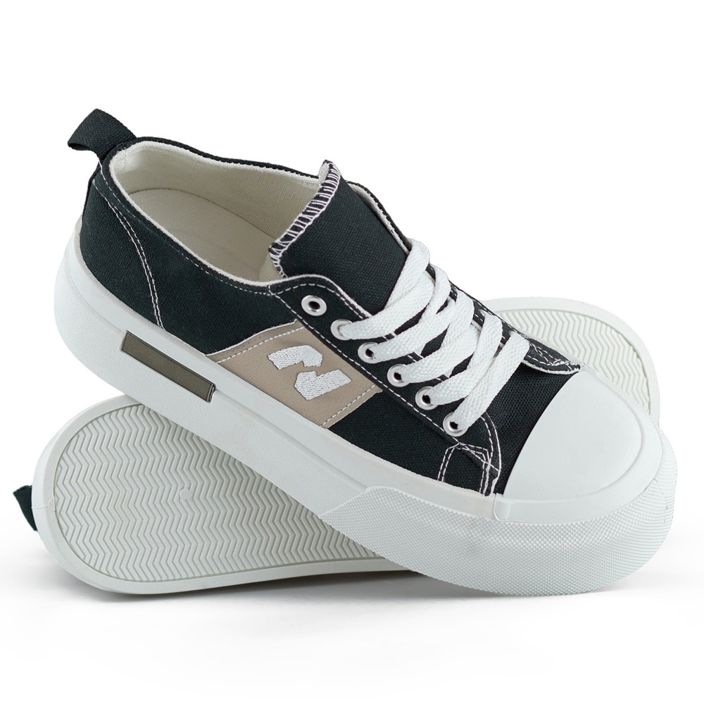 Prezentujemy stylowe czarne trampki damskie, które wyróżniają się na tle innych modeli dzięki swojej grubej platformie. Wykonane z wysokiej jakości tkaniny, te niskie trampki łączą komfort z modnym designem. Okrągły nosek zapewnia swobodę ruchu, a klasyczny czarny kolor sprawia, że pasują do wielu stylizacji - od casualowych po bardziej eleganckie.