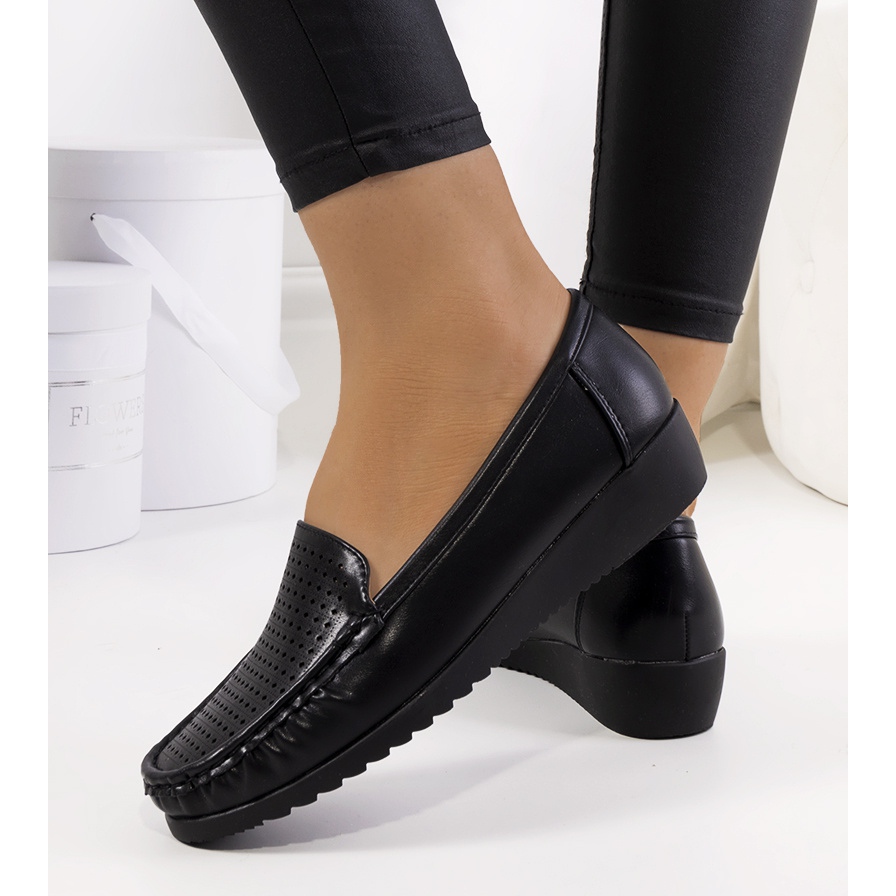 Czarne mokasyny na koturnie Dalal to znakomity wybór na wiosenne dni, które doskonale dopełnią każdą stylizację. Te eleganckie buty damskie wyróżniają się cholewką wykonaną z jakościowej skóry ekologicznej, ozdobioną stylowym ażurowym wzorem, który dodaje im lekkości i oryginalności.