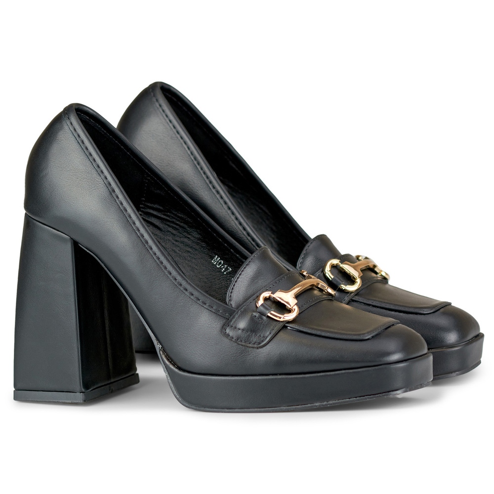 Czarne mokasyny na wysokim, wygodnym obcasie to połączenie klasyki i nowoczesnego szyku — idealne dla kobiet, które cenią elegancję i komfort na co dzień oraz podczas ważniejszych wyjść.