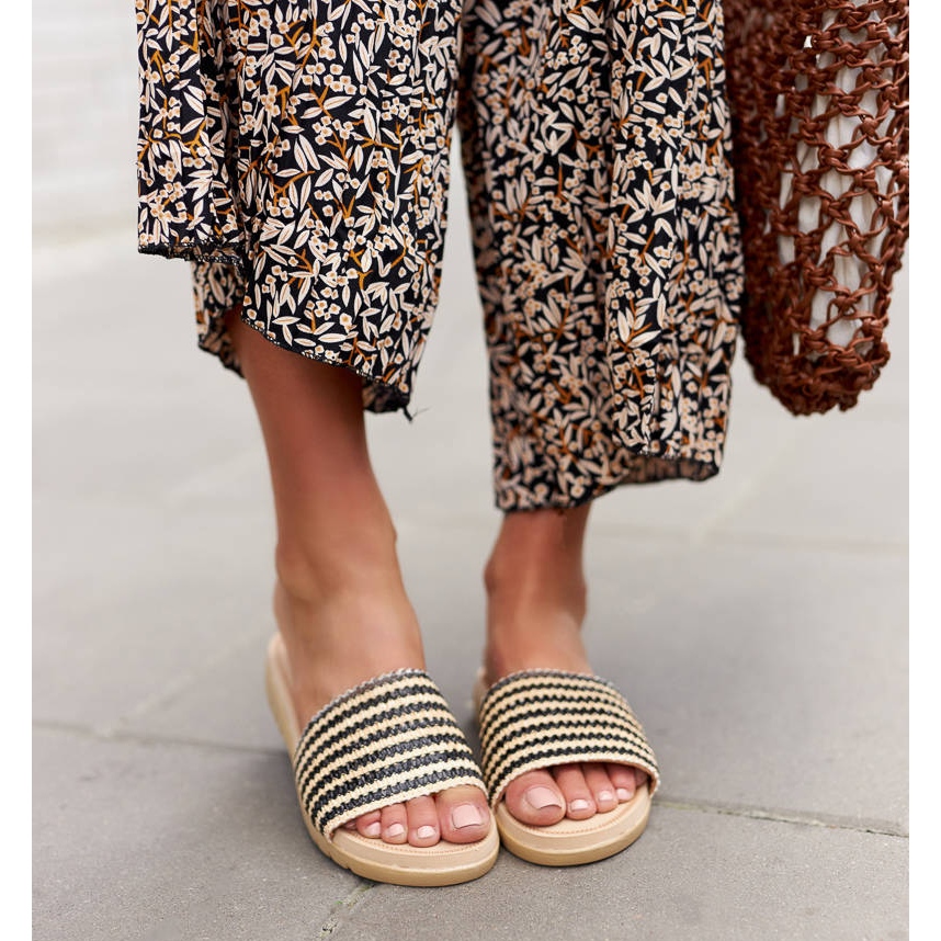 Model cechuje się płaskim obcasem o wysokości 3 cm, co sprawia, że są nie tylko stylowe, ale także bardzo komfortowe w noszeniu przez cały dzień. Dzięki standardowej numeracji, łatwo dopasujesz je do swojego rozmiaru. Ich unikalny wzór w pasy dodaje im charakteru, a brak noska zapewnia swobodę i wentylację, co jest szczególnie cenne w cieplejsze dni.