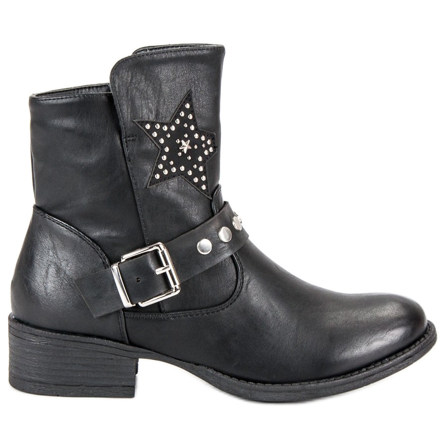 Odkryj swoją rockową stronę z naszymi wyjątkowymi czarnymi botkami, które staną się niezastąpionym elementem Twojej garderoby. Stylistyka tych butów przyciąga wzrok - elegancka ozdobna sprzączka oraz subtelna gwiazda wykonana z koralików dodają im niepowtarzalnego charakteru. Te botki idealnie komponują się z rockowymi stylizacjami, jednak równie dobrze pasują do codziennych, casualowych zestawień.