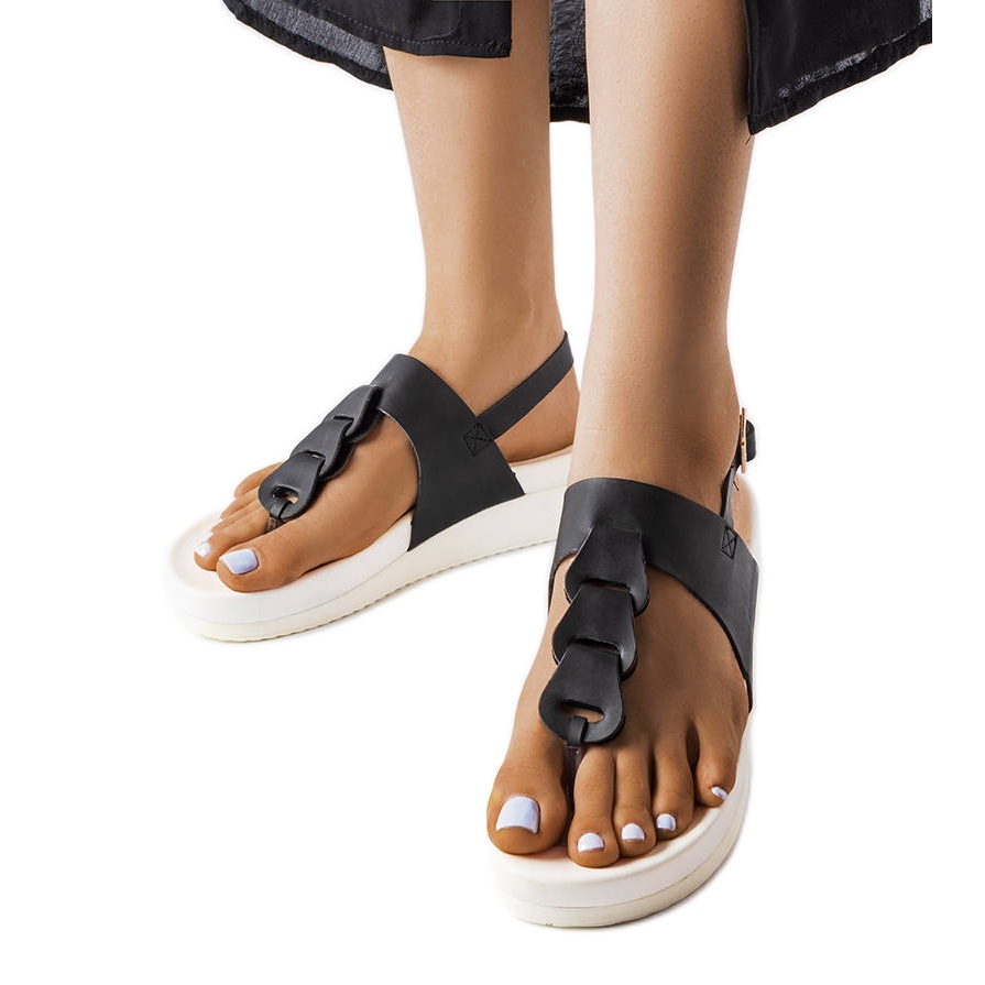 Eleganckie damskie japonki na stabilnym koturnie o wysokości 4,5 cm. Klasyczna czerń cholewki wykonanej ze skóry ekologicznej łączy się z kontrastową, białą podeszwą z gumy — efektowny, a zarazem uniwersalny look, który pasuje zarówno do codziennych, jak i bardziej eleganckich letnich stylizacji.