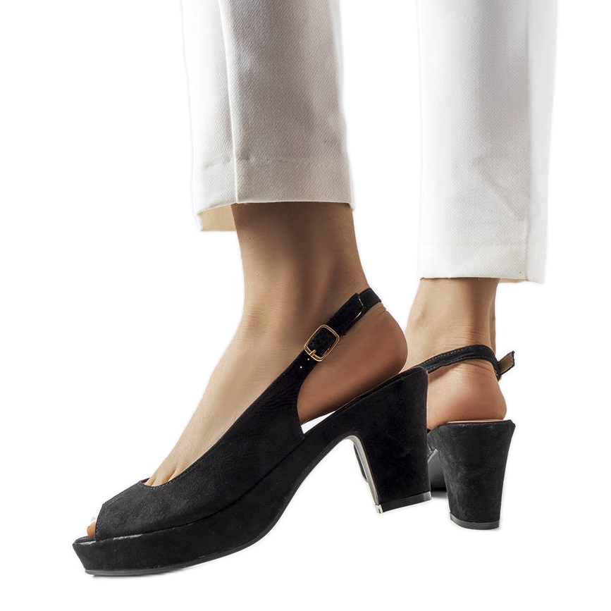 Czarne sandały na słupku Dionne łączą klasyczną formę z nowoczesnym minimalizmem. Wykonane z ekologicznego zamszu i ekoskóry, z wygodną wkładką ze skóry ekologicznej i trwałą podeszwą z tworzywa sztucznego. Słupkowy obcas o wysokości 7 cm zapewnia pewny krok, a regulowana sprzączka pozwala na idealne dopasowanie.