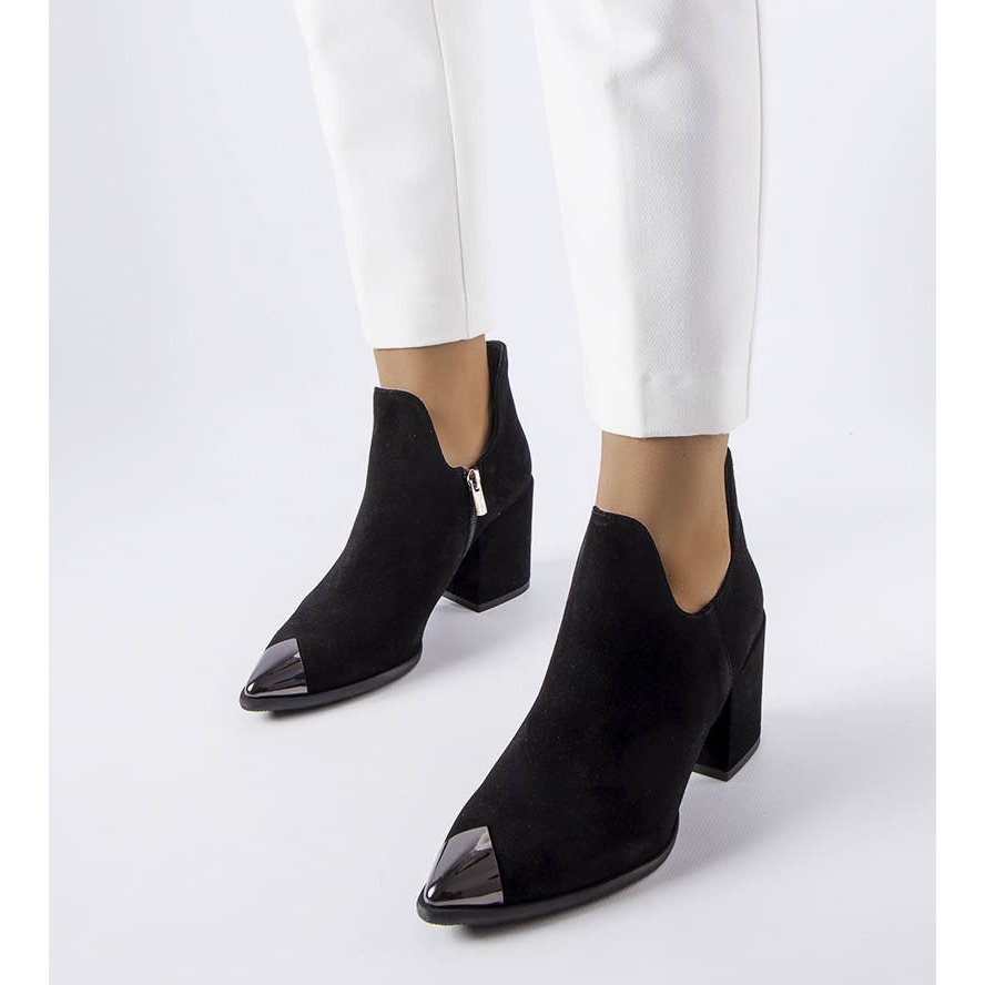 Czarne skórzane botki Karino — stylowe, komfortowe i gotowe na codzienne wyzwania. Wykonane z naturalnej skóry zamszowej, sięgają za kostkę i prezentują elegancki, kowbojski fason z nowoczesnym szpiczastym noskiem ozdobionym srebrną metalową wstawką. Niski obcas typu słupek o wysokości 7 cm zapewnia stabilność i kobiecą sylwetkę, a zamek błyskawiczny po wewnętrznej stronie ułatwia zakładanie.