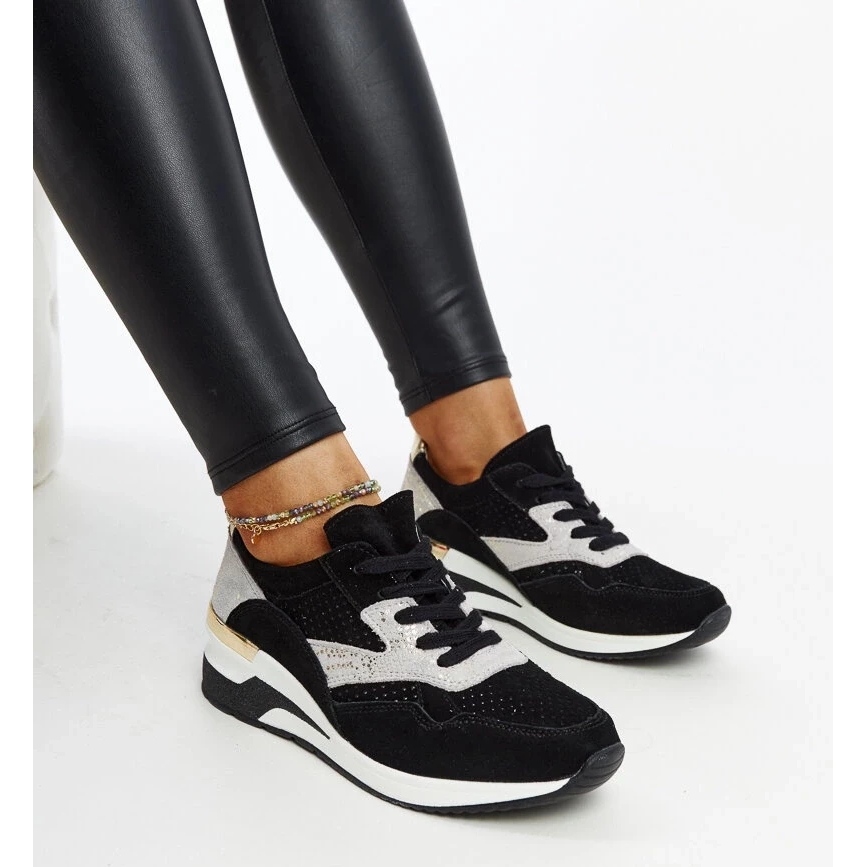 Wysokość koturna wynosząca 11,5 cm pozwala na komfortowe podniesienie sylwetki, jednocześnie nie rezygnując z wygody, jaką oferują sportowe buty. Sneakersy Manfrin są dostępne w eleganckim czarnym kolorze, który doskonale komponuje się z różnorodnymi stylizacjami.