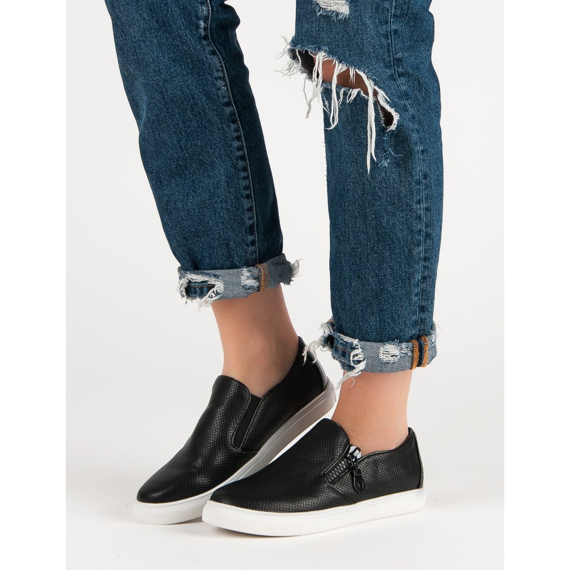 Czarne slipony od firmy Weide to elegancka i stylowa propozycja dla nowoczesnych kobiet, które cenią sobie komfort oraz modny wygląd. Te wsuwane buty, pozbawione obcasów, zostały wykonane z wysokiej jakości skóry ekologicznej, co czyni je idealnym wyborem dla osób dbających o ekologię. Ciekawym detalem jest ozdobny suwak, który dodaje im oryginalności i charakteru.
