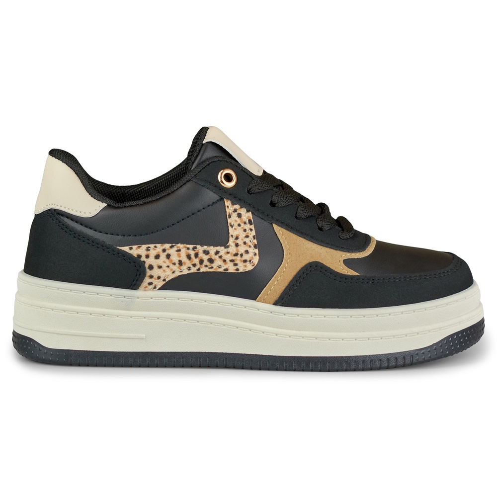 Czarne sneakersy Lara wyróżniają się okrągłym noskiem oraz niską wysokością, co zapewnia komfort noszenia przez cały dzień. Platforma o wysokości 4 cm dodaje nieco wzrostu, jednocześnie gwarantując stabilność i wygodę. Sznurkowane zapięcie umożliwia idealne dopasowanie do stopy, a syntetyczna podeszwa zapewnia dobrą przyczepność i trwałość.