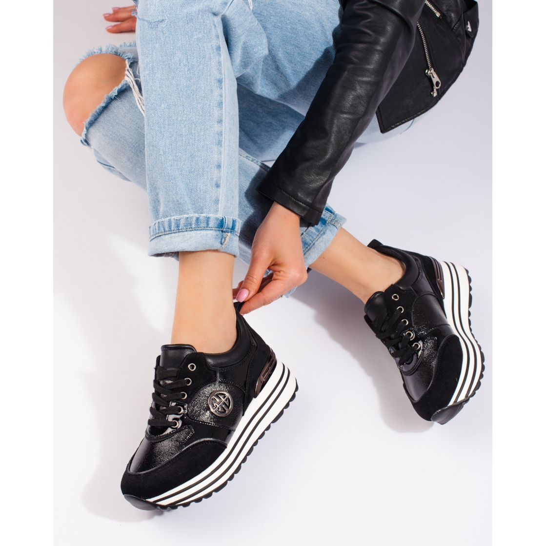 W. Potocki W. Potocki Czarne sneakersy damskie na koturnie Potocki