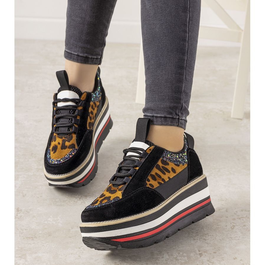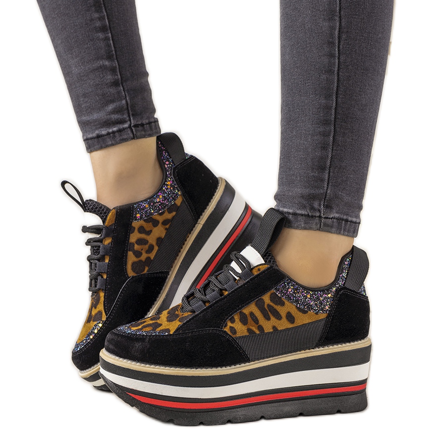 Czarne sneakersy na wysokiej podeszwie Debbi to idealne połączenie stylu i komfortu, które zachwyci każdą miłośniczkę mody. Ten model, wzbogacony unikalnym wzorem panterki i subtelnym brokatem, wyróżnia się na tle innych modeli, przyciągając wzrok i dodając charakteru każdej stylizacji.