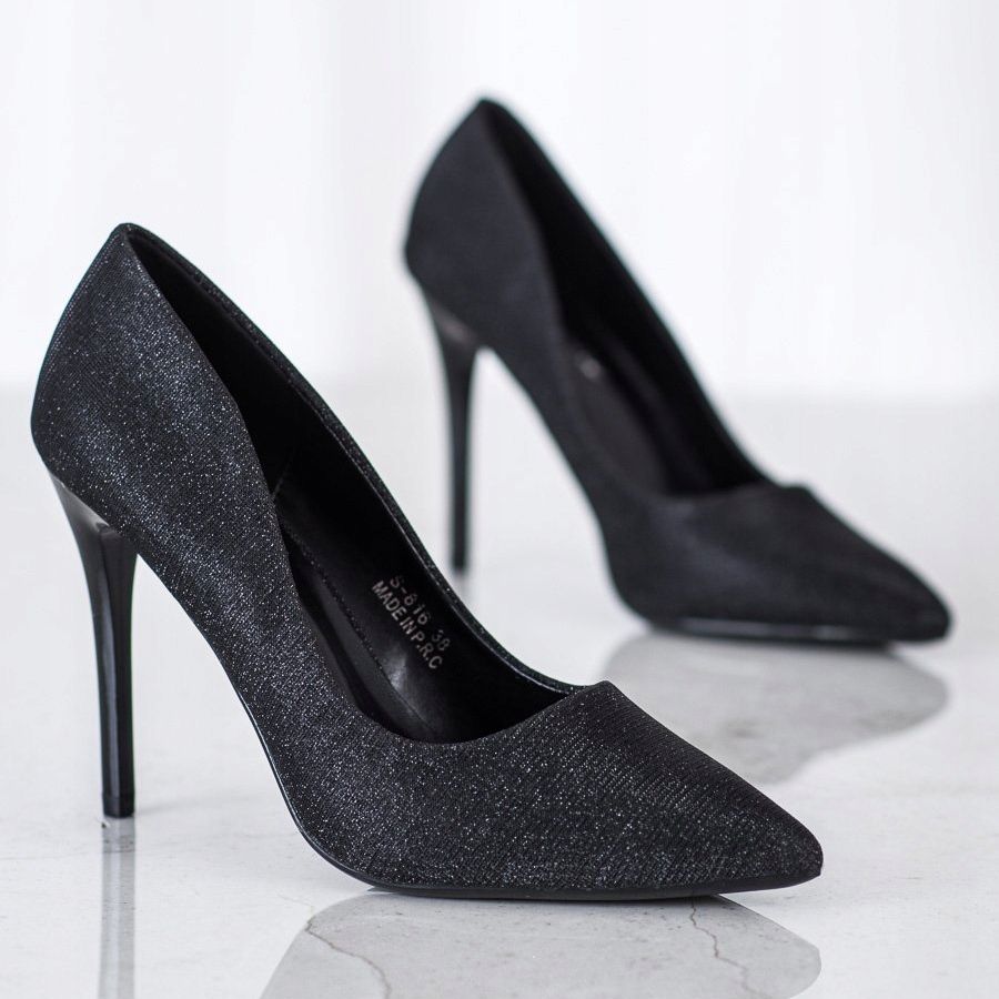 Czarne szpilki z brokatem posiadają szpiczasty nosek, co jest charakterystyczne dla najmodniejszych fasonów w świcie mody. Praktyczność zapewnia fakt, że są to modele wsuwane, co ułatwia szybkie zakładanie i zdejmowanie butów.