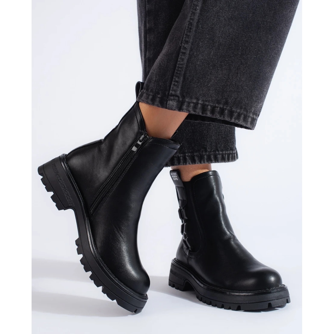Szczegóły: Czarne sztyblety damskie na czarnej podeszwie