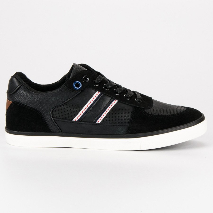 Uniwersalne, wygodne i ponadczasowe — te czarne trampki męskie to obowiązkowy element męskiej garderoby. Wykonane ze skóry ekologicznej ze stylowymi wstawkami ze zamszu ekologicznego, łączą sportowy charakter z elegancką prostotą. Dominująca czerń z subtelnymi akcentami (brązowy element z tyłu i białe paski po bokach) sprawia, że buty łatwo dopasujesz do wielu stylizacji.