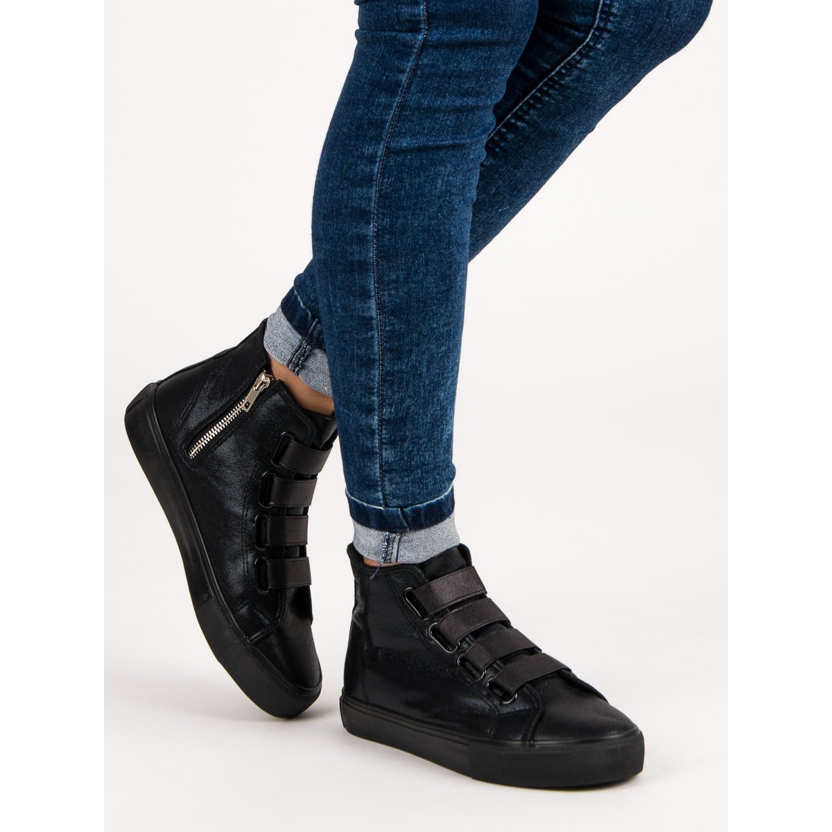 Ciesz się szybkością ubierania dzięki wygodnemu zapięciu na zamek w srebrnym kolorze, które znajduje się z boku buta. Dodatkowo, gumowe taśmy w miejscu sznurówek nie tylko utrzymują stabilność stopy, ale także nadają trampkom drapieżnego i nowoczesnego stylu. Wysoki krój sięgający kostki oraz miękki zapiętek sprawiają, że idealnie przylegają do stopy, co zwiększa komfort użytkowania.
