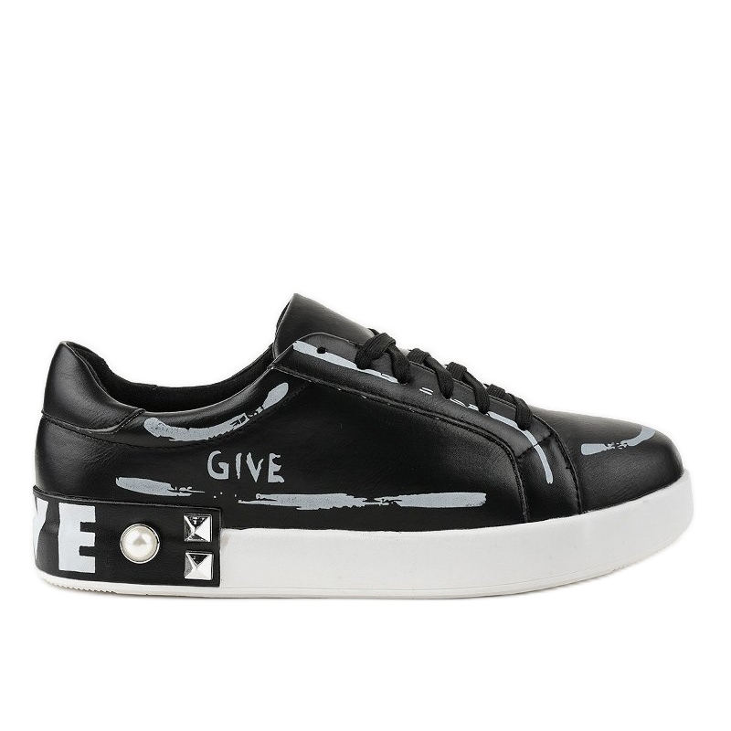 Czarny kolor cholewki wyróżnia się białymi nadrukami, dodającym nieco świeżości i nowoczesności. Z tyłu butów umieszczona jest materiałowa tasiemka ozdobiona ćwiekami, która nadaje im charakteru i podkreśla ich oryginalność.